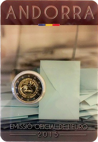 Motiv:Zum 30. Jubiläum der Volljährigkeit mit 18 Jahren in Andorra. Das Motiv zeigt einen jungen Menschen bei der Stimmabgabe in eine Wahlurne.
