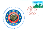 Motiv:Anlässlich der ersten EU-Ratspräsidentschaft der Slowakei. Das Motiv zeigt das Wappen der Slowakischen Republik vor dem Hintergrund fächerförmig angeordneter geschwungener Linien, die zur Mitte hin verlaufen, welche die Stellung und die Bedeutung der Slowakischen Republik während ihres EU-Ratsvorsitzes symbolisieren.