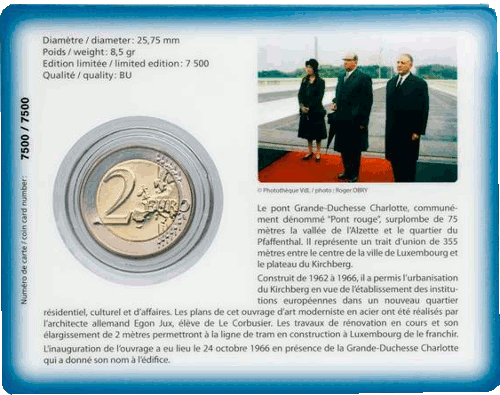 Ausführliche Beschreibung des Ausgabeanlasses:Die Brücke ist nach Charlotte von Luxemburg benannt. Die Brücke wurde nach Plänen des Architekten Egon Jux gebaut und 1965 fertiggestellt. Sie wurde am 24. Oktober 1966 eingeweiht. Sie überspannt den Stadtteil Pfaffenthal in einer Höhe von 74 m über der Alzette. Ihre Länge beträgt 355 m bei einer Stützweite von 234 m, die Breite liegt bei 25 m und das Gesamtgewicht bei über 4.900 Tonnen. Die Brücke hat jahrelang Selbstmörder angezogen. 1990 wurde deshalb eine Schutzwand aus Plexiglas installiert, die Sprünge von der Brücke verhindern soll. Im Jahr 2015 begannen umfangreiche Sanierungsarbeiten an der Brücke. Die Straßenführung wird grundlegend verändert, vor allem um Platz für die zukünftige Straßenbahn zu schaffen. Zudem werden die Fußgänger- und Radfahrwege auf beiden Seiten vergrößert und die Plexiglasinstallation durch eine metallische Gitterstruktur ersetzt. Zum Abschluss der Arbeiten soll die Brücke einen neuen Anstrich bekommen.