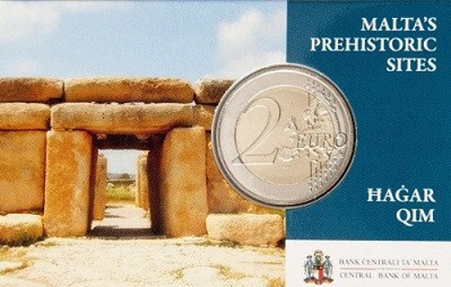 Ausführliche Beschreibung des Ausgabeanlasses:In diesem Tempelkomplex finden sich die Reste von vier Tempeln, die zwischen 3600 und 2500 v. Chr. entstanden sind, darunter der am besten erhaltene Südtempel. Er gehört einerseits zwar an den Anfang der Tempelphase, entstand aber in seiner heutigen Form durch diverse Umbauten in der Spätphase und ist ein für Malta einmaliger agglutinierender Tempel. Keramikfunde belegen seine Nutzung ab der Mġarr-Phase während der gesamten Tempelkultur in der Geschichte Maltas. Der ursprüngliche, in seiner Ahornblattform noch erkennbare Tempel wurde im zentralen Teil, im Bereich der oberen Altarnische, mit einem zweiten Eingang versehen und damit profaniert. Dies belegt die weitgehende Entfernung der Bodenplatten in diesem Bereich. Die linke Raumbucht dieses Tempelteils wurde nach links durch einen Korridor erweitert, der den internen Zugang zum Tempelteil ermöglicht. Dieser ersetzt offenbar die Raumbucht im Bereich, so dass der rot-gelbe Bereich als eine Einheit aufgefasst werden kann. Der Tempel hat auch wieder den zuvor üblichen, gegenüber viel älteren Anlagen nur mehr rudimentären Kopfaltar (aber keine zweite Raumbucht und keinen separaten Zugang). Die Tempel haben separate äußere Zugänge, sind aber Innen im Vergleich zu der alten, im Tempel sichtbaren Form, anders strukturiert. Im vorderen Teil des Alttempels wurden zwei mit Farnrelief verzierte Altarblöcke und die Venus von Malta gefunden. Seine beiden Raumbuchten oder Apsiden sind durch geschlossene Megalithreihen unterteilt, die nur fensterartige Durchbrüche haben, die vermutlich dieselbe Funktion hatten die nun der Orakelnische zukam. Die mit der Umgestaltung verbundene religiöse Umwälzung führte offenbar auch dazu, dass die Bevölkerung nun Zugang zu kleinen, offenen Außentempeln und zur so genannten Orakelnische erhielt. Sie hat eine Öffnung zum Tempelteil durch die nicht etwa geweissagt wurde, sondern Opfergaben in den Tempel geworfen werden konnten, die sich im rot gestrichelten Bereich ansammelten, der von einer niedrigen Steinbarriere eingefasst war. Dass es sich um eine zumeist mit Auseinandersetzungen verbundene Aktion handelte, zeigen Reste von figürlichen Darstellungen die im grau gestrichelten Bereich gefunden wurden. Dieser Teil war einst durch das (graue) Füllmaterial der Zwickelbereiche unzugänglich, so dass die hier sekundär wiederverwandten (entsorgten) Steinbilder nicht mehr sichtbar waren. Die Tempel wurden aus globigerinem Kalkstein errichtet. Die Fassade des gesamten Komplexes wurde von einem Bankaltar zur Ablage von Opfergaben umgeben, die übliche Exedra wurde völlig ersetzt. Neben dem östlichen Außentempel, bei der Orakelnische liegt der größte Monolith der je in einer maltesischen Tempelfassade verwendet wurde. Er ist 3 m hoch, 6,40 m lang und wiegt etwa 20 t. An der Nordseite befindet sich ein stehender Megalith von 5,20 m Höhe. Die Anlage war den Bewohnern Maltas zwar seit jeher durch frei stehende Steine bekannt, sie wurde jedoch erst seit 1839 mit systematischen archäologischen Ausgrabungen komplett freigelegt. 1992 wurde Ħaġar Qim, gemeinsam mit anderen bronzezeitlichen Tempelanlagen Maltas, als die Megalithischen Tempel von Malta zum UNESCO-Weltkulturerbe erklärt. 2009 wurde die Anlage von Ħaġar Qim, wie auch das benachbarte Mnajdra, zum Schutz vor schädlichen Umwelteinflüssen mit einer Zeltkuppel überdacht, die für die Zeit der Restaurierung in den nächsten ca. 20 bis 25 Jahren stehen bleiben soll. ©Wikipedia