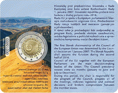 Motiv:Anlässlich der ersten EU-Ratspräsidentschaft der Slowakei. Das Motiv zeigt das Wappen der Slowakischen Republik vor dem Hintergrund fächerförmig angeordneter geschwungener Linien, die zur Mitte hin verlaufen, welche die Stellung und die Bedeutung der Slowakischen Republik während ihres EU-Ratsvorsitzes symbolisieren.