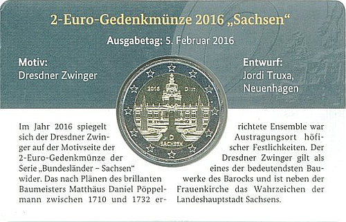 Motiv:Anlässlich der Bundesratspräsidentschaft Sachsens 2016. Abgebildet ist der Dresdner Zwinger. Entstanden ab 1709 als Orangerie und Garten sowie als repräsentatives Festareal.