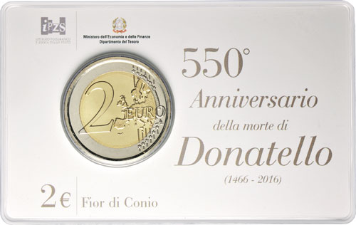 Ausführliche Beschreibung des Ausgabeanlasses:Donatello wurde in Florenz als Sohn des Wollkämmers Niccolò di Betto Bardi geboren. Sein Name wird 1401 zum ersten Mal anlässlich einer Prügelei in Pistoia urkundlich erwähnt. Vasari berichtet, dass er sich mit Brunelleschi von 1402 bis 1404 in Rom aufgehalten habe, die Reise ist allerdings nicht urkundlich nachzuweisen. Dort habe er die Überreste der Antike kennengelernt, an denen er seinen Stil bildete, welcher die Renaissance in der Skulptur auf der Grundlage eines eindringlichen Naturstudiums einleitete. Donatello vereinigt auf großartige Weise Antike und Natur, unmittelbares Leben und Stil und war ein bahnbrechender Meister in der Freistatue, im zartesten Relief, im Porträt, in der Gewandung, in der Darstellung von Kindern und sanften Frauen (Madonnen) und in der Komposition von dramatischer Kraft. Ein kühner Techniker in der Skulptur, war er zugleich ein vorzüglicher Zeichner und Maler und trug ebenso sehr zur Regeneration der Malerei bei, wie die ganze Skulptur des 15. Jh. bis Michelangelo unter seinem direkten Einfluss stand. Er führte den in der Antike eingeführten und im Mittelalter eher vernachlässigten Kontrapost wieder ein. Mehrere Hauptwerke Donatellos galten als verloren, verbrannt 1945 in einem Berliner Bunker. Nun sind die Werke in Moskauer Puschkin-Museum wieder aufgetaucht, in kriegsbeschädigtem Zustand aber restaurierbar. Der David des Donatello ist ein Jüngling. Er steht, bis auf den mit einem Lorbeerkranz verzierten Hut und die ledernen Strümpfe, unbekleidet zum Teil auf dem abgeschlagenen Kopf des Goliath. Das Besondere an der Darstellung ist nicht nur die Nacktheit der Skulptur, sondern die innere Spannung des Körpers, des so genannten Kontraposts. Das gesamte Gewicht der Figur ruht auf dem rechten Bein, das linke Spielbein ruht fast lässig auf dem Haupt des Goliath. Dieser durch die natürliche Haltung vorgegebenen leichten Neigung der Hüfte steht der entgegengesetzte Schwung des aufgerichteten Oberkörpers entgegen. Die linke Hand, unter dem angewinkelten Arm leicht auf der Hüfte aufsetzend, hält den Stein, der geschleudert wurde. Das Motiv des festen rechten Beines wird von der Schwerthand - sie stützt sich darauf - wiederholt. Der Kopf ist leicht nach links unten mit dem Blick auf den Erschlagenen gewendet. Donatello arbeitete einige ungewöhnliche anatomische Details ein, so etwa die Faltenbildung am Hals, an der linken Achsel und dem Gesäß. Durch den leichten Brustansatz und die weiblich anmutende Wölbung des Unterleibes erhält die Figur einen fast androgynen Charakter. Dies wird auch als ein Hinweis auf die Homosexualität Donatellos gesehen. Dass sie latent verbreitet war, mag aus der Begeisterung für die griechische Antike herrühren. ©Wikipedia