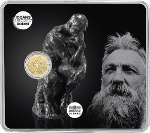 Motiv:François-Auguste-René Rodin (* 12. November 1840 in Paris; † 17. November 1917 in Meudon) war ein französischer Bildhauer und Zeichner. Das Motiv zeigt sein Porträt recht. Im linke Teil der Münze sein wohl berühmtestes Werk: Der Denker.